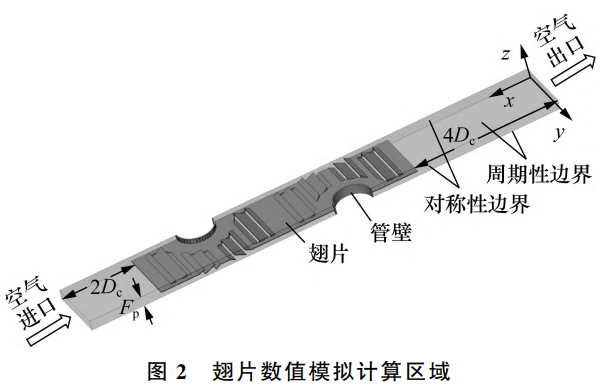 翅片在換熱器中周期性排布,且翅片單元之間是相互對稱關(guān)系,在考慮計算機計算能力與效率后,選定換熱器2列換熱管中間的空氣流通區(qū)域作為數(shù)值模擬區(qū)域。如圖2所示,數(shù)值模擬區(qū)域的高度為Pt/2;為避免計算過程中產(chǎn)生回流現(xiàn)象,計算區(qū)域進口段向翅片區(qū)域上游延長2倍管外徑距離,出口段向翅片區(qū)域下游延長4倍管外徑距離,故數(shù)值模擬區(qū)域的長度為2Pl+6Dc。數(shù)值模擬區(qū)域的寬度取Fp,且翅片布置在數(shù)值模擬區(qū)域正中間1/2Fp位置處。